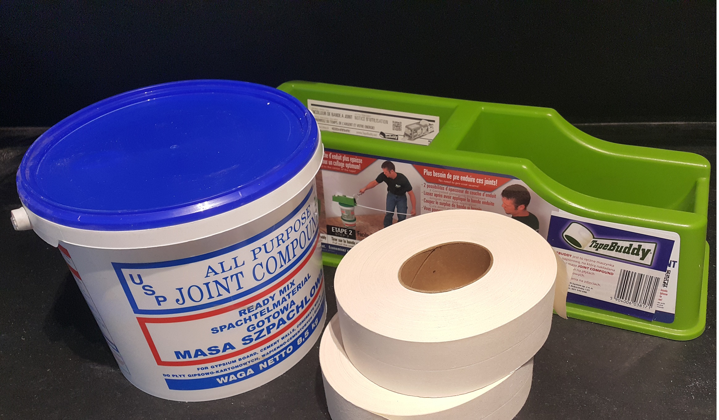 Zestaw  dla majsterkowiczów. Zaczynasz swoja przygodę z suchą zabudową albo robisz niewielkie inwestycje,  ten zestaw jest dla Ciebie. Maszynka do spoinowania tape buddy, dwie taśmy do spoinowania i 8,5kg lateksowej, gotowej masy do spoinowania Joint Compound. Wszystko w dostępnej cenie 212zł. Oszczędzaj i  zarabiaj. Zapomnij o reklamacjach o pęknięciach na łączeniach.